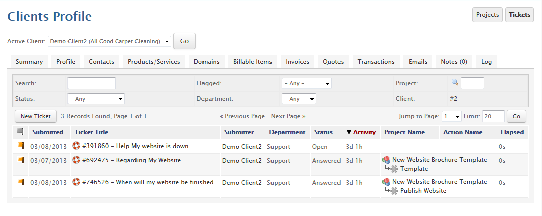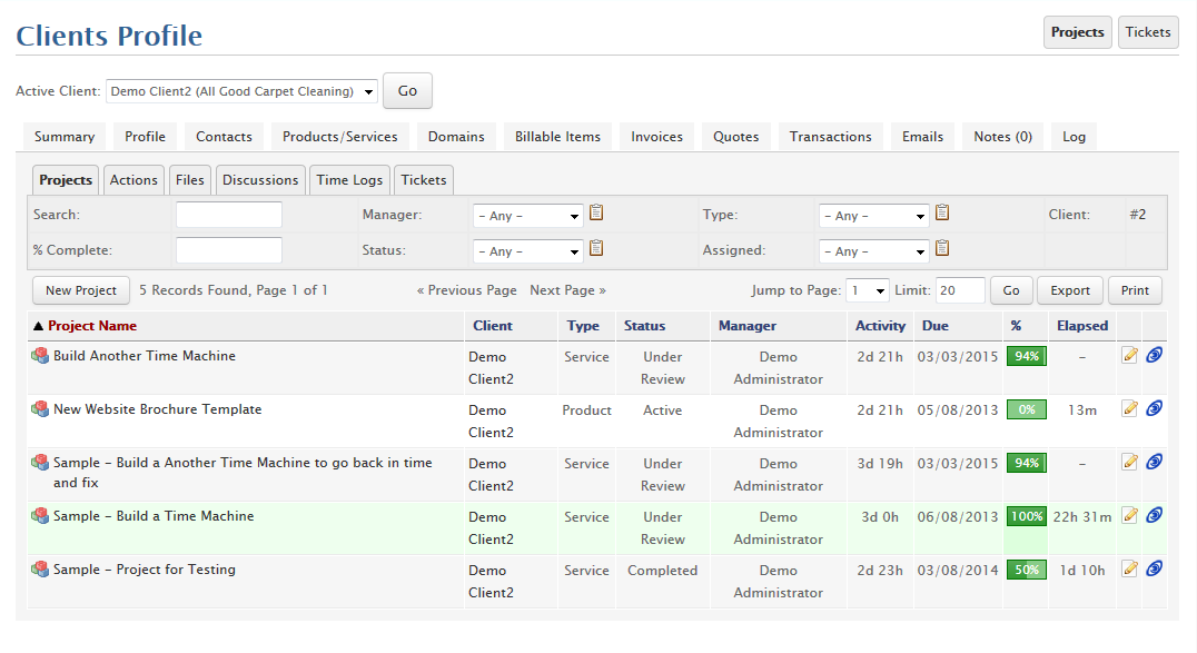 Added to the top-right header area of the WHMCS Client Profile pages are two new tabs that provide access to Project and Ticket assets related to the specific client. The list views provided within the Client Profile operate with the same functionality as other list views found throughout the system, providing search filters, column sorting, and exporting to CSV.