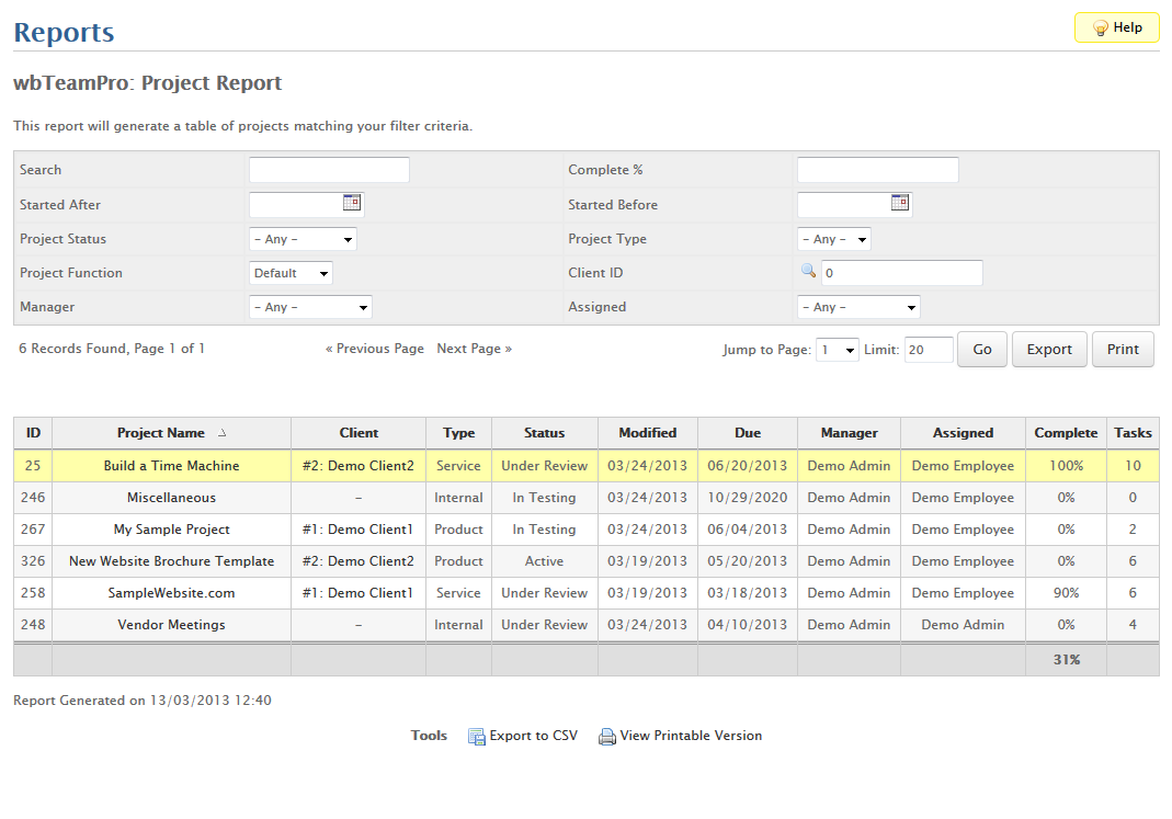 Included with the several list tables within wbTeamPro are Print and Export reports. Each report provides granular filter controls and the ability to print or export the resulting records in a CSV format for use with other data sources.